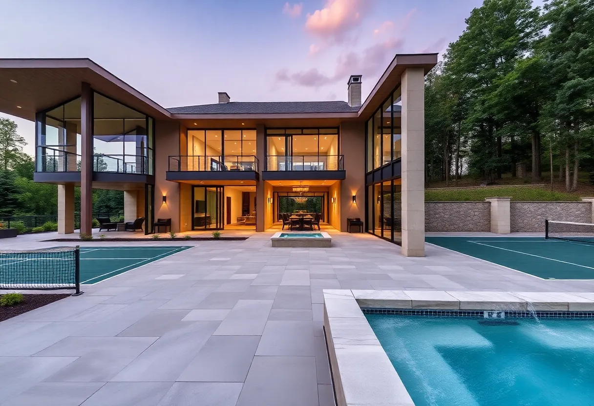 The property boasts an impressive layout featuring five bedrooms, six bathrooms, and two half baths. Large, floor-to-ceiling windows allow for breathtaking natural views throughout the home. Designed for both entertainment and comfort, the estate includes a gourmet kitchen equipped with high-end appliances, a dedicated movie theater, and a golf simulator for leisure activities.