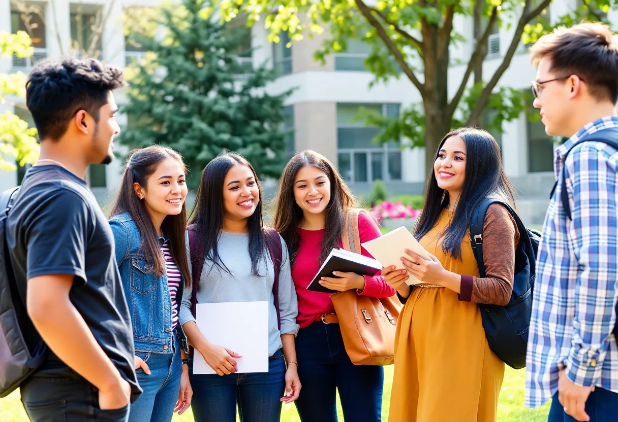 Diverse university students discussing in an outdoor setting on campus